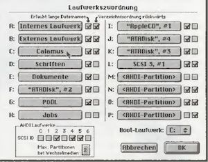 Klicken Sie in das graue Feld neben der Zuordnung „C:". Es öffnet sich die Mac OS-Dateiauswahl. Suchen Sie den Ordner „Calamus" im Ordner „SL2002" und wählen Sie ihn aus. Ordnen Sie andere Laufwerke nach Ihren Bedürfnissen zu.