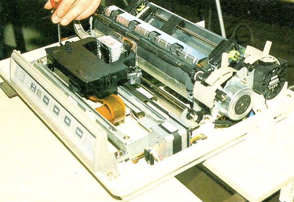 Übernommen hat man die solide Schalldämpfung, die dem vorgeführten Prototypen allerdings noch fehlte. Verschwunden ist die im Gehäuseboden eingelassene Digitalanzeige, auch die drei seitlichen Tasten befinden sich nicht mehr an ihrem alten Platz. Statt dessen sind alle Bedienungselemente und die Digitalanzeige auf der Stirnseite des Druckers untergebracht. Die Einstellung für die Anzahl der Durchschläge befindet sich jetzt auch nicht mehr unterhalb des Druckkopfes: Ein seitlicher Hebel sorgt nun für leichte Bedienbarkeit. In puncto Benutzerfreundlichkeit hat sich aber noch mehr getan: DIP-Schalter sind abgeschafft und durch menügesteuerte Druckersoftware ersetzt. Alle Menüs und Dialoge bringt der neue Pinwriter während der Einstellung zu Papier.
