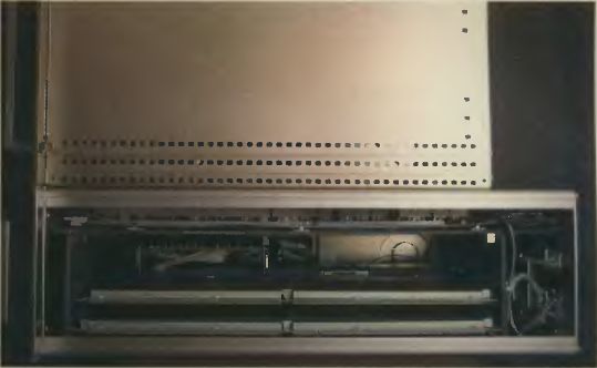 Der S II (Bild 1) ist ein ST im 19-Zoll-Gehäuse. Auch der schwarzweiße Monitor ist in diese Bauform verpackt. Der seitliche Blick ins Innere (Bild 2) zeigt, daß hier bis zu vier STs gleichzeitig arbeiten. Die Standardausführung kommt mit zwei STs aus. Außerdem bietet das zentrale Gehäuse Platz für vier Laufwerke, Festplatten von 20 bis 130 MByte, die Tastatur hat ein neues Gehäuse und ein Trackball ersetzt die Maus.