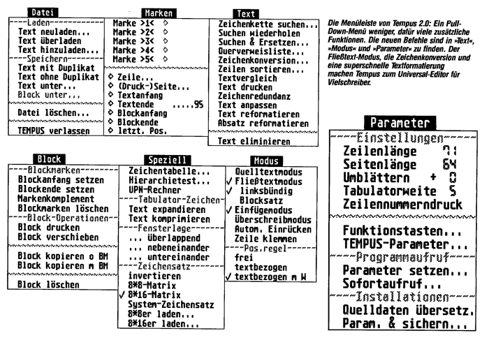 ASCII-Zeichen zur Übernahme in die Texte an. Alternativ kann der Benutzer viele Zeichen direkt über Tastenkombinationen oder als Dezimalwerte eingeben. Die beiden letzten Methoden funktionieren sogar in den Eingabefeldern der Tempus-Dialogboxen. Die meisten neuen Errungenschaften von Tempus 2.0 finden sich hauptsächlich in den Menüs »Text«, »Modus« und »Parameter«, soweit sie durch Mausbedienung zugänglich sind. Das Menü »Modus« steuert die Umschaltung zwischen zeilenorientierter Quelltextverarbeitung und den beiden Fließtexteinstellungen »linksbündig« und »Blocksatz«. In beiden Fließtextmodi formatiert Tempus die Texte direkt bei der Eingabe, sogar beim Einfügen und Ausschneiden von Texten. Natürlich in Tempus-Geschwindigkeit, also ohne merkbare Verzögerung. Wir haben die Direktformatierung einem extremen Test unterzogen. Mit ein paar Tricks und mehrfachem Kopieren erzeugten wir einen 495 KByte langen Text mit 6188 Zeilen ä 75 Zeichen, der weder Leerzeichen noch Zeilenvorschübe enthielt. Für Tempus bildete dieser Text praktisch ein einziges Wort. Zum Einfügen eines Zeichens in die erste Zeile benötigte Tempus nicht mehr als 6,4 Sekunden und hatte tatsächlich einen Buchstaben aus der Zeile 6188 in die Zeile 6189 geschoben.