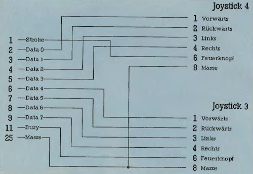 - zwei 9polige Sub-D- bzw. Can-non-Stecker (für Joystick 3 und 4, männlich),