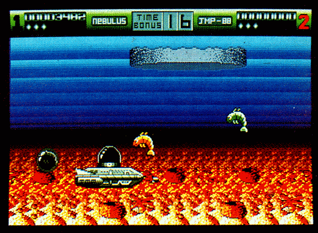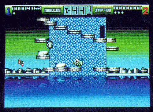 Technisch zeigt Nebulus den ST von seiner Glanzseite: Den verblüffenden Dreh-Effekt, das fließende Scrolling und die flotte Sprite-Animation erwartet man eigentlich nicht von der grauen 512-KByte-Maschine. Auch an fetzigen Sound, teilweise digitalisiert, hat der Programmierer gedacht. Ein winziges Detail verdient aber besondere Anerkennung: Im Wasser spiegelt sich der Turm und das Spielgeschehen, komplett mit Farbverlauf und Wellen-Bewegung. Da darf man sich schon mal fragen: »Wie hat der Programmierer das nur gemacht?«