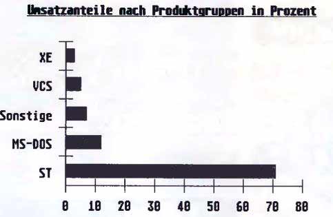 Die wichtigste Produktgruppe bleibt für Atari auch nach der Komplettierung der PC-Reihe der Atari ST, wie unsere Grafik zeigt. Um der stärkeren Nachfrage im Bereich Desktop Publishing folgen zu können, etablierte Atari bereits 29 DTP-Center. Insgesamt sind 50 geplant. (hb)