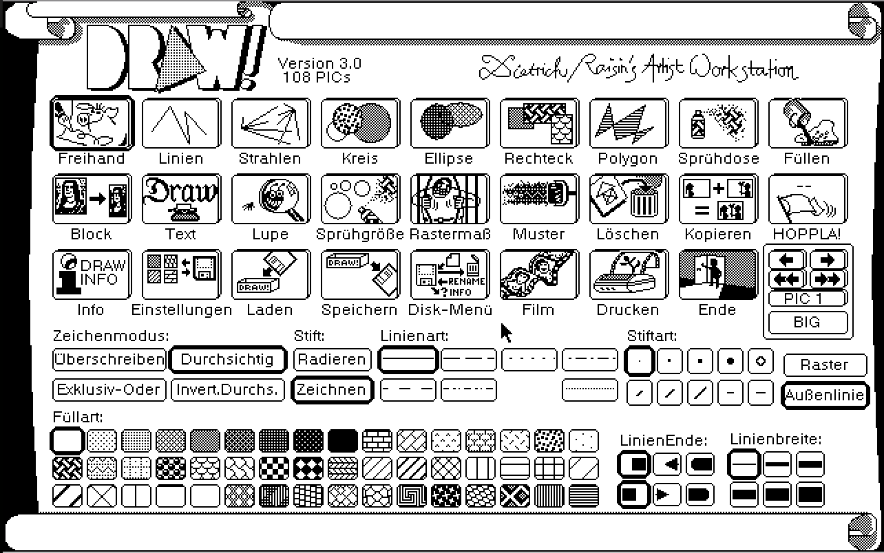 Sie tätigen fast alle Aktionen mit der Maus, wobei Sie mit der rechten Maustaste zwischen den Arbeitsbildschirmen und dem Hauptmenü umschalten. Letzteres stellt sozusagen das »Herz« von DRAW dar. Hier wählen Sie zwischen den einzelnen Funktionen, stellen Parameter wie Füllfarbe, Strichstärke oder das Linienende (zum Beispiel Kreis oder Pfeil) ein. Selbstverständlich verfügt DRAW über die Zeichenprogramm-typischen Funktionen wie Freihandzeichnen, Linien, Strahlen, Füllen, Kreise, Rechtecke und Sprühen. Weiterhin dürfen Sie Bilder laden und speichern, Bilder drucken und diverse Diskettenoperationen tätigen. DRAW liest alle gängigen Bildformate. Hervorheben wollen wir, daß das Programm auch Neochrome-Bilder lädt und sie für den Schwarzweiß-Bildschirm konvertiert.
