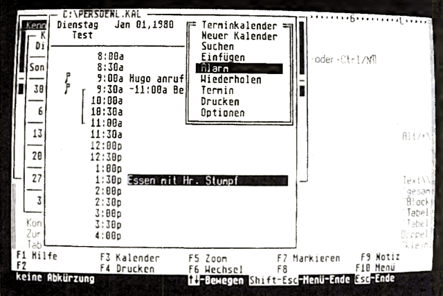 Trotzdem ist bemerkenswert, daß sich Hans-Jörg Sack erst zu diesem Zeitpunkt in die Maschinensprache des NEC V30 einarbeitete. Nachdem das BIOS ebenfalls sehr schnell fertiggestellt war, begann eine Testphase. In dieser Zeit wurden die Fehler aufgespürt und aus dem Programm verbannt. Als letztes fiel ein Fehler in der Cursorsteuerung und einer in der Festplattenroutine dem Debugging zum Opfer. Auf letzteren stießen wir während der Vorführung in der Redaktion. Er äußerte sich darin, daß sich Sidekick Plus nicht auf der Festplatte installieren ließ.