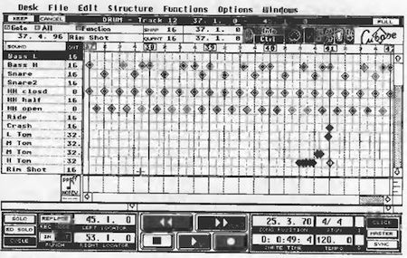 Auch der Drum-Editor bedarf kaum der näheren Erläuterung. Sie ordnen zunächst jedem Instrument die entsprechende Note zu und arrangieren dann in einer übersichtlichen Tabelle die Schlagzeug- und Percussions-Pattern. Steinberg liefert für die gebräuchlichsten Synthesizer und Drumcomputer Setups mit, so daß Sie im Regelfall sofort mit dem Drum-Editor arbeiten können. Sie müssen lediglich die gewünschten Parts per Mausklick in Schlagzeug-Parts umwandeln.