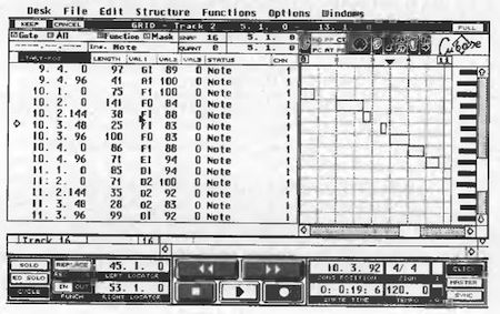 Optimale Kontrolle über die vorliegenden MIDI-Daten bieten die fünf verschiedenen Editortypen: Grid-, Key-, Score-, Drum- und Logical Edit. Grundsätzlich erlauben alle Editoren Real-time-Editierung. Der Grid-Editor besteht im Prinzip aus zwei Teilen: der Event-Liste, in der alle MIDl-Daten chronologisch geordnet sind, und dem Grid, das die Events grafisch anzeigt. Im Gegensatz zum Twenty-Four läuft hier bei aktivem Sequenzer in der Event-Liste ein Pfeil und im Grid ein »Lineal« zur genauen Positionsbestimmung mit. Dieser Editor eignet sich besonders für die Feinarbeit, wie Handquantisierung, Korrektur von Parts oder der Anpassung von Anschlagsdynamik und Notenlänge.
