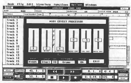Über die reinen Sequenzeranwendungen hinaus emuliert Cubase verschiedene Funktionen eines Digital-Delays. Mit Hilfe dieses »MIDI-Prozessors« erzielen Sie interessante Echo-, Pitch-, Shifting-und Arpeggio-Effekte. Der »MIDI-Prozessor« ist durchaus in der Lage, für einige Effekte ein externes Delay zu entlasten. Bedenken Sie jedoch, daß die Softwarelösung Stimmen am angeschlossenen Synthesizer verbraucht.