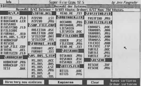 Super-Filecopy: eine Hilfe vor allem für ST-Besitzer, die nur über ein Disketten-Laufwerk verfügen. Das Programm erspart Ihnen die bisweilen lästigen Diskettenwechsel, zu der Sie das Betriebsystem auffordert, wenn Sie einzelne Dateien kopieren wollen. Nach dem Start des Programms erscheint eine grafisch schön gestaltete Übersicht des gesamten Inhalts der Diskette. Jetzt können Sie die zu kopierenden Dateien bequem anklicken und in den Hauptspeicher laden. Von dort kopiert das Programm auf die zuvor ausgewechselte Diskette.