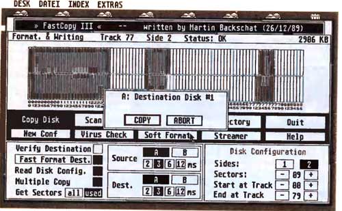 Mit der neuen Funktion »New Conf« kopieren Sie eine Diskette und ändern gleichzeitig das Format. In der rechten unteren Box stellen Sie dabei das zu erzeugende Diskettenformat ein. Diese Funktion ist sehr nützlich, um beispielsweise einseitige Disketten auf ein doppelseitiges Format umzukopieren oder um aus einer 9- eine 11-Sektoren-Diskette zu machen. Mit »Virus?« testen Sie Ihre Diskette auf Boot-Viren und eliminieren diese gegebenenfalls. Dabei zeigt Ihnen Fastcopy auf Wunsch auch den Boot-Sektor an. Durch die Funktion »Soft Format« löschen Sie das Inhaltsverzeichnis und die FATs auf der Diskette. Dies ist äußerst praktisch, um volle Disketten schnell zu löschen. Zudem können Sie bei dieser Gelegenheit ein neues Diskettenformat im Boot-Sektor eintragen und so etwa schnell zwischen ein- und zweiseitigen Formaten umschalten. Die Funktion »Streamer« kopiert eine Festplatten-Partition auf eine oder mehrere Disketten und umgekehrt. Dabei kopiert Fastcopy nach Wunsch alle oder nur die belegten Sektoren. Für eine Sicherheitskopie einer vollen 10-MByte-Partition auf 14 Disketten benötigt Fco-py nur etwa 15 min. Sollte der Anwender Probleme mit der Handhabung von Fastcopy haben, so steht ihm die Funktion »Help« zur Seite, die alle wichtigen Einstellungen und Funktionen kurz erklärt.