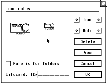 Fangen wir mit dem Desktop an: Gemini kann selbstverständlich fast alles, was auch der Atari-Desktop kann. Es stellt Dateien als große oder kleine Icons oder auch als Text dar. Im Textmodus lassen sich Datums- und Größenanzeige wahlweise abschalten. Die Ausgabebreite paßt sich stets an die Fenstergröße an - daher gibt es keinen horizontalen Slider — bei ausreichender Fensterbreite wird der Text mehrspaltig ausgegeben. Für verschiedene Dateinamen lassen sich auch eigene Icons installieren Wie alle Teile von Gemini nutzen die Anzeigeregeln nicht die ausdrucksschwachen TOS-Wildcards, sondern die leistungsfähigeren »Regular Expressions«, die auch von Unix-Shells verwendet werden. Wem die mitgelieferten Icons nicht gefallen oder wer noch mehr Icons benötigt, braucht nur zu einem Resource Construction Set zu greifen und weitere Bildchen zu entwerfen.