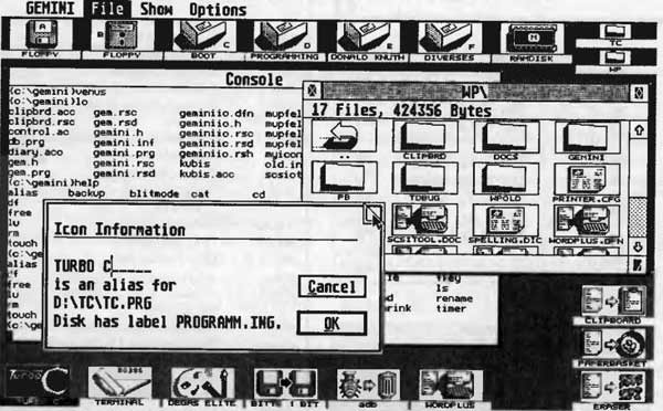 Besonderer Clou: Gemini merkt sich nicht nur den kompletten Zugriffspfad, sondern auch den Namen der Diskette und fordert im Zweifelsfall zum Einlegen der richtigen Diskette auf — selbstverständlich funktioniert das auch mit Wechselplatten.