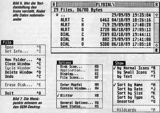 Die Fenster bedienen Sie fast vollständig über die Tastatur. Mit < Control W > blättern Sie zwischen den Fenstern (wie bei Turbo-C). Die Buchstabentasten steuern bestimmte Dateien an. Ein Druck auf < D > positioniert beispielsweise das Fenster so, daß es möglichst alle mit < D > beginnenden Dateien zeigt In Verbindung mit < Shift > passiert dasselbe mit Ordnernamen. Die Cursortasten scrollen auf- und abwärts. < Backspace > schließt den aktuellen Ordner und — sehr wichtig— < Undo > macht alle Fensteroperationen wieder rückgängig.