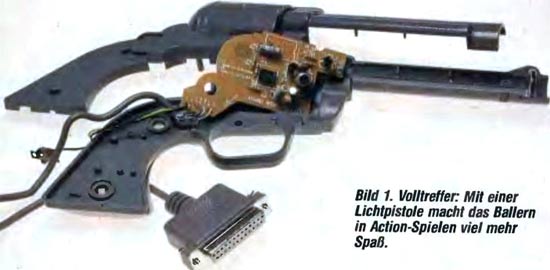 Im Bild 1 sehen Sie eine gebräuchliche Lightgun in Form eines Wildwest-Revolvers, wie ihn das Spiel »West Phaser« der Softwarefirma Loriciel verwendet. Die an der Mündung angebrachte Linse hat die Aufgabe, den ankommenden Lichtimpuls gebündelt auf das lichtempfindliche auf der Platine zu richten. Diese Methode ist zwar nicht besonders zielsicher, reicht jedoch zum Spielen vollkommen aus. (ba)
