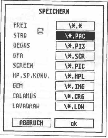 Reichhaltig wie die Textfunktionen fällt die Ausgestaltung von Graffiti im Bereich Dateiformate aus. In Bild 4 lassen wir Sie einen Blick auf das geplante »Speichern«-Menü werfen — kaum ein Format, das hier nicht erscheint. Von einiger Bedeutung durfte der Punkt »FIP.SP.KONV« sein — sollte sich dahinter etwa eine HPGL-Anpassung verbergen? Die Spekulation ist nicht ohne jede Berechtigung, ließen die Autoren doch durchblicken, daß sie bereits an einem Modul zur Objekt-Grafik arbeiten, welches in weiten Bereichen dieselben Leistungen aufweisen soll wie der Pixel-Modus, und dann auch die Einbindung von Objekt-Fonts beinhalten wird.