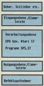 Doch nun zum eigentlichen SPS/ST: Betrachten wir hier zuerst die bereitgestellte Hardware, die die Schnittstelle zwischen den peripheren Komponenten (Näherungsschalter etc.) und dem ST übernimmt. Diese in Modultechnik aufgebauten Geräte (einschließlich Netzteil) bestehen aus mehreren Einzelgehäusen, die, um einen sicheren Kontakt der Steckerleisten zu gewähren, ihren Zusammenhalt durch einfache Druckknöpfe finden. Über den ROM-Port erfährt das gesamte System Anschluß an den Atari ST. Über ein Flachbandkabel gelangt der ST-Bus zum SPS-Interface, das die Datenaufbereitung (z.B. Erzeugung des AO-Signals aus UDS etc.) sowie weitere Signale mittels digitaler Logik und einem Pal für den sogenannten ST5-Bus generiert. Diese Signale stehen dann an einer 32poligen VG-Leiste des Moduls bereit. Danach gelangen die Signale und Daten weiter zu den jeweiligen Adreßdecodern und Pegelshiftern, den Ein- und Ausgabemodulen und so weiter. Der ST5-Bus bildet eine Kaskade, indem er über die VG-Leiste von Modul zu Modul weitergelangt und dem Anwender somit maximal 4096 Ein- und Ausgabeleitungen zur Verfügung stellt. Zur visuellen Kontrolle über Eingangs- oder Ausgangsdaten erhält jeder Kanal eine Leuchtdiode.