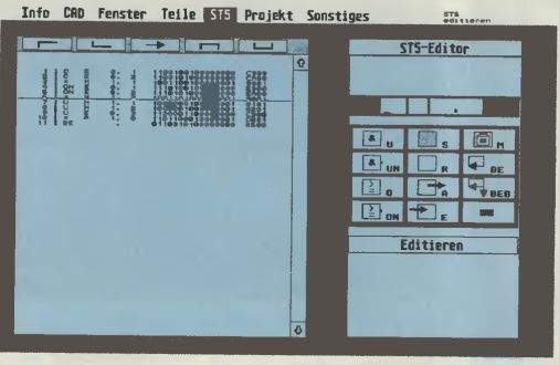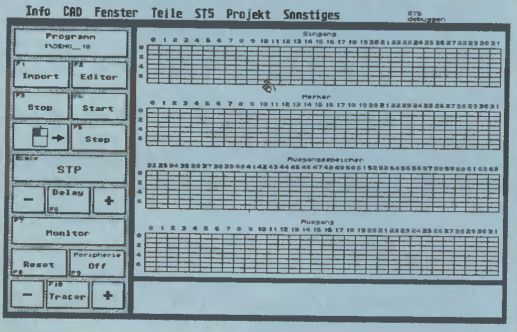 Über die Programmiersprache ST5 läßt sich im Editor-Menü ein logischer Zusammenhang zwischen den Ein- und Ausgabegeräten sowie den Bauteilen programmieren. Die am meisten benötigten Befehle lassen sich sehr komfortabel durch die Maus eingeben, was allerdings eine manuelle Tastatureingabe in manchen Fällen nicht ausschließt. Selbständige Plausibilitätskontrollen des Editors erleichtern das Programmieren und verhindern unlogische Arbeitsschritte. Einige weitere interessante Editor-Funktionen wie beispielsweise der Import (von Diskette laden) von Programmteilen, der Export — also die Ausgabe von Programmteilen — (zu Drucker, Diskette oder Modem-Port) oder diverse Block- und Kopieroptionen vervollständigen das durchdachte Bild, das di 'ses Programm bis jetzt schon vermittelte.