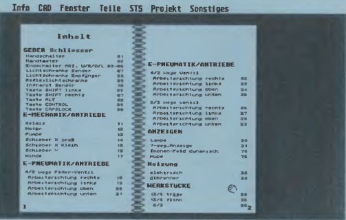 Ein Buch im Programm erweist sich dem Benutzer als wertvolle Hilfe zur Bedienung des Hauptprogrammes. Klicken Sie im Info-Menü den Unterpunkt SPS-ST an, dann gelangen Sie in ein Menü, wobei sich (siehe Bild) ein Buch auf dem Bildschirm zeigt und der Mauszeiger die Form einer Hand annimmt. Ein Bewegen des Mauszeigers von links nach rechts und umgekehrt sowie von unten nach oben etc. bewirkt ein Weiterblättern im Buch. Über das CAD-und Fenster-Menü lassen sich prinzipielle Zeichenfunktionen wie Füllen, Radieren, Texteingabe und Zeichnen sowie Verschieben, Kopieren, Löschen, Drehen etc. vollziehen. Diese Funktionen benötigt der Anwender zum visuellen Design seines Projekts. Zum Aktivieren verschiedener Bauteile kann der Anwender über die »Holen-Funktion« wiederum aus einem Katalog die gewünschten Bauteile auswählen. Ob es sich hier um Arbeitszylinder, Geber, Schließer oder digital-elektronische Bauelemente handelt, all diese Elemente lassen sich durch einfaches Eingeben der teilespezifischen Nummer anwählen. Auf dem Monitor sehen Sie dann ein Fadenkreuz, an dem das ausgewählte Bauteil haftet. Positionieren und fixieren läßt es sich dann mit einem einfachen Mausklick an beliebiger Stelle. An jedem Bauteil befinden sich einige Nummern. Diese Nummern kennzeichnen die Schnittstelle zum Automatisierungsgerät, denn jedes Bauteil muß ja entweder mit einem Ausgabe-oder Eingabekanal der SPS verbunden sein. Jeder Bauteilschnittstelle ist ein bestimmter Steckplatz und Kanal zuzuordnen. Dieses Zuordnen geschieht unter dem Menüpunkt »verbinden«. Nach einem Mausklick am entsprechenden Verbindungspunkt des Bauteils erkennt SPS-ST eine Schnittstelle, und der Mauszeiger nimmt die Form eines Fragezeichens an. Jetzt weisen Sie der Schnittstelle einen Steckplatz und Kanal zu; 31.7 bedeutet z.B. Steckplatz 31 und Kanal 7. SPS-ST kontrolliert diese Parameter bei der Eingabe. Ist Ihr Wert falsch, so macht Sie das Programm darauf aufmerksam.