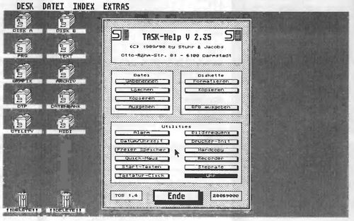 Multi-Accessories sind längst keine Sensation mehr. Funktionsfülle und Bedienungskomfort verdoppeln sich bei jeder Programmgeneration. Neben den kommerziell vertriebenen Helfern steht eine kaum mehr überschaubare Fülle von Public-Domain-Accessories zur Verfügung. Von »Stuhr&Jacobs« aus Darmstadt kommt »Task Help«, ein Multi-Accessory, welches bereits in der Version 2.35 vorliegt. Auf den ersten Blick bietet sich dem Anwender ein reichhaltig bestücktes Hauptmenü, das Hilfe im Umgang mit Dateien wie mit Disketten, mit Uhrfunktionen wie Druckeraktionen umfaßt. Einzelne Dateien lassen sich umbenennen, löschen, kopieren oder auf Monitor bzw. Drucker ausgeben. Die entsprechenden Gegenstücke zur Bearbeitung von Ordnern fehlen. Unter der Rubrik »Diskette« sind die Funktionen formatieren, kopieren und »BPB ausgeben« enthalten; letzteres steht für eine Anzeige der Bios-Parameter einer Diskette. Interessanterweise läuft die Formatierung im Hintergrund ab, doch erfährt die Tätigkeit des Anwenders eine durchaus spürbare Beschränkung. Das Formatierungsmenü bietet die Wahl zwischen ein- und zweiseitig, 80 und 82 Spuren (an 81 Tracks, für manche Benutzer knapp justierter Laufwerke interessant, hat offenbar niemand gedacht). Die Kopierfunktion lief nicht ganz reibungslos, beispielsweise benötigte Task Help mehrere Versuche, um das Format der eigenen Diskette zu identifizieren; als problematisch erwies sich die Anzahl der zu kopierenden Spuren. Während eines Formatier- oder Kopierdurchgangs ist der Zugriff auf das Accessory notwendigerweise gesperrt. Nach erfolgter Diskettenbearbeitung klappte das Beenden nicht so recht, wenn der Mauszeiger nicht zu sehen war. Erst mehrfaches Drücken der Return-Taste ließ das Menü verschwinden.