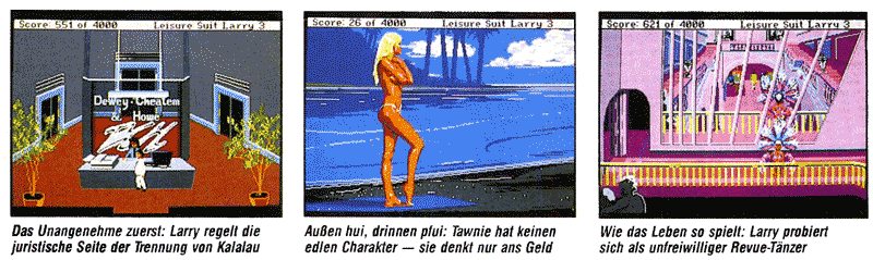 Der wahre Bienenhonig scheint’s aber nicht gewesen zu sein — Teil III beginnt (einmal mehr) mit einem Rausschmiß. Larry als Ehemann? Ein Widerspruch in sich! Unser ewiger Junggeselle merkt schnell, daß er ganz schön abgeschlafft sein muß durch das paradiesische Dasein. Nicht einmal Schwiegerpapi will ihn mehr als Vize seiner Firma »Natives Inc.«. Man muß wissen, daß die Insulaner seit dem unrühmlichen Ableben des tyrannischen Doktor Nonookee einiges zum Vorteil des idyllischen Eilands verändert haben. Da, wo einst paradiesischer Urwald wucherte, flimmern jetzt die Segen moderner Zivilisation: ein Nachtclub z. B. und ein Spielcasino mit luxuriösem Neun-Etagen-Hotel oben drauf. Eben alles, was ein echter Lebemann und Playboy so braucht. Aber derartige Späße kosten natürlich Geld.