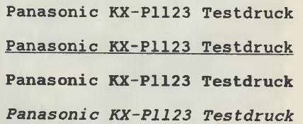 Auch eine Textprobe prädestiniert den 24-Nadler für alle Bereiche des Schriftverkehrs. Über Emulationen und die vielen Fonts, die der KX-P1123 beherrscht, konnte die Redaktion allerdings keine präzise Aussage treffen, da — wie bereits erwähnt — das Handbuch noch nicht verfügbar war. Da jedoch die Grafikausgabe über ein NEC-P6-bzw. die Schriftprobe über ein Epson-Druckprogramm keinerlei Probleme macht, braucht man hier nichts zu befürchten.
