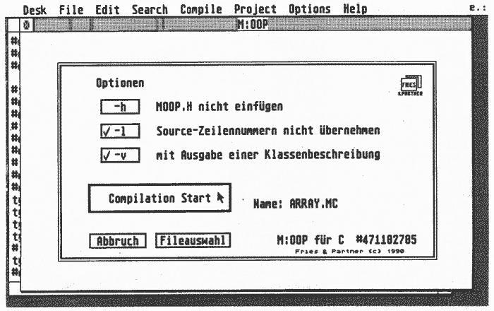 M:OOP ist keine Demonstration von Bedienungskomfort. Eine Kommandozeilenversion des Compilers gestattet den Aufruf aus Command-Line-Interpretern (CLIs) heraus, Batch-Dateien automatisieren hierbei den Programmablauf. Darüber hinaus liefern Fries & Partner ein Compiler Accessory, das sich jedoch prinzipbedingt als Speicherfresser entpuppt. Sowohl Accessory als auch Kommandozeilenversion benötigen einige Dateien zum reibungslosen Ablauf der Kompilation. Die dazu notwendigen Pfade muß der Anwender beim Kommandozeilenprogramm als eigene Environment-Variable eintragen, das Accessory hingegen kümmert sich keinen Deut darum, so daß unter Umständen längeres Suchen fällig ist. Allzuviel bleibt an M:OOP aber ohnehin nicht zu bedienen, ganze drei Schalter zieren das Hauptmenü. Da M:OOP weder über einen eigenen Editor noch über einen Linker oder ähnliches verfügt, erübrigen sich weitere Einstellungen (Abb. 1).