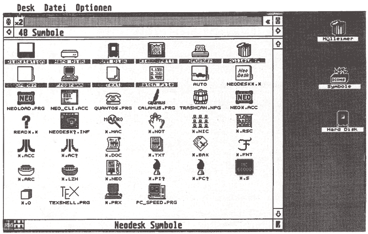 Genauso wie Gemini zeichnet sich Neodesk vor allem durch seine reiche Palette an Icons aus, die man einzelnen Dateien zuordnen kann. Außerdem lassen sich in der neuesten Version sieben Fenster gleichzeitig öffnen und übereinanderlegen. Dabei zählen allerdings eventuell geöffnete Accessories mit. Auch die Neodesk-Fenster verdienen besondere Beachtung. Auf den ersten Blick unterscheiden sie sich kaum von den GEM-Fenstern. Doch ihr Pep liegt im Detail. Beispielsweise erzeugt ein Klick auf »x2« im linken oberen Eck eine zweite Ausgabe des betreffenden Fensters — praktisch für Umkopieraktionen innerhalb derselben Laufwerksebene. Gegenüber auf der rechten Seite legt ein Mausklick auf das Gänsefüßchen das betreffende Fenster in den Hintergrund. Und da, wo einst der horizontale Scroll-Balken sein Dasein unter GEM fristete, findet sich nun der Name der Diskette bzw. Partition. Ein Verschieben des Fensterinhalts in horizontaler Richtung ist nicht mehr erforderlich, denn Neodesk sorgt für optimale Ausnutzung des verfügbaren Raums und setzt — soweit möglich — auch zweispaltige Inhaltslisten in die Fensterfläche.