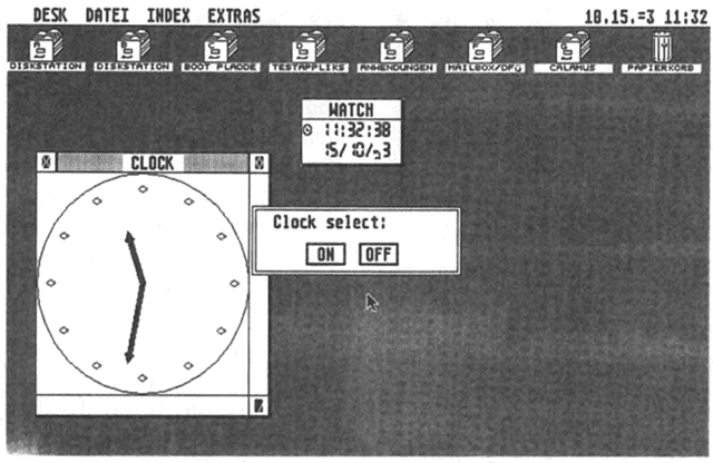 Wer seine Atari-Systemzeit demnächst von einer Atomuhr steuern lassen möchte, kann für 98 Mark den »Chronos« in den Joystick-Port seines heimeigenen Compis stecken. Das Chronos-Modul ist ein DCF-77-Empfänger, der das Rundfunksignal der Atomuhr des PTB in Braunschweig empfängt und dem ST dadurch zu ultrapräziser Systemzeit verhilft. Um die Zeitanzeige auch standesgemäß spektakulär zu präsentieren, lassen sich dazu verschiedene Accessories (z. B. »Deskuhr.acc«) installieren, die die Systemzeit digital oder analog in einem kleinen GEM-Fenster präsentieren. Den Chronos gibt es im gut sortierten Fachhandel oder direkt bei Digital Image, (hu)
