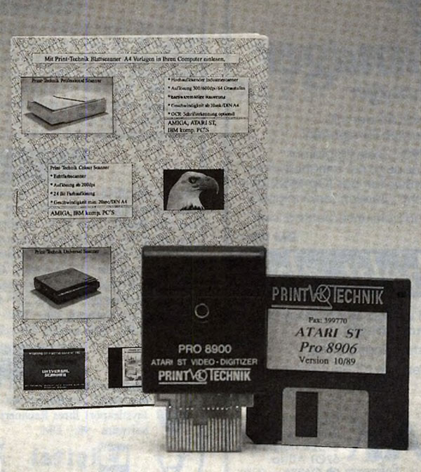 Auch die Münchner Firma »Print Technik« beschäftigt sich seit langem mit Grafik-und Videoanwendungen für den Atari ST. Der Digitizer aus München auf dem Prüfstand: »Pro 8900« von Print Technik. Auch dieses Digitizer-Paket besteht aus einem Hardware-Modul für den ROM-Port sowie Betriebs-Software nebst Dokumentation. Auch diverse Farbfilterscheiben gehören laut Hersteller zum Lieferumfang.