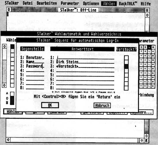 STalker verwaltet 30 Telefonnummern und wĂ€hlt sie auch automatisch. Dabei kann man mehrere Boxen hintereinander anrufen, was die Erfolgsaussichten auf Kontakt steigert. ZusĂ€tzlich zu diesen Nummern werden noch andere Parameter verwaltet, so z.B. die benutzte Schnittstelle und die Terminal- und Protokollparameter. AuĂerdem verwaltet STalker fĂŒr jede Nummer bis zu acht Autologin-Texte. Damit lĂ€Ăt sich die Box anwĂ€hlen und direkt einloggen, ohne dabei eine einzige Taste zu drĂŒcken. ZusĂ€tzlich kann man eine Routine in BackTALK ausfĂŒhren lassen. Besonders das Feature mit Autologin-Texten hat uns gut gefallen: Da lassen sich Inhalte verstecken und PaĂwörter fĂŒr unterschiedliche Systeme ablegen. Als ernsthafter Schutz freilich sinnlos, da STalker das PaĂwort ungeniert sendet, so daĂ theoretisch unbefugte Benutzer einfach unter falschem Namen in die Mailbox gelangen. Da wĂ€re ein PaĂwortschutz der INF-Datei sinnvoller. Ob die Begrenzung auf 30 Telefonnummern heute noch zeitgemÀà ist?
