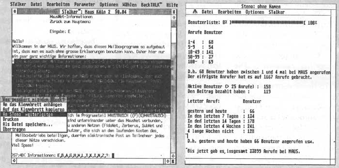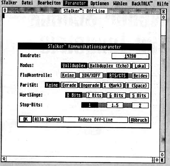 BackTALK heiĂt die Programmiersprache in STalker. Dabei ist BackTALK ein umfangreiches Werkzeug, eine strukturierte Programmiersprache mit Variablen, Prozeduren und Funktionen. Die Syntax ist an C angelehnt, aber auch Modula-2 oder Pascal-Programmierer werden zurechtkommen. Wie mĂ€chtig und umfangreich BackTALK ist, lĂ€Ăt der gewichtige Abschnitt im STalker-Handbuch ahnen. Eine EinfĂŒhrung zeigt, wie man Programme schreibt. AuĂerdem ist ein umfangreicher Referenzteil vorhanden, der alle Funktionen erlĂ€utert. Ăber BackTALK lassen sich sĂ€mtliche STalker-Parameter abfragen und Ă€ndern. ErwĂ€hnenswert ist die in STalker integrierte Mini-Mailbox, die es gestattet, auch von anderen Rechnern auf den eigenen ST zu Hause zuzugreifen. So kann man mal schnell eine Datei, die man vergessen hat mitzunehmen, per Modem holen.