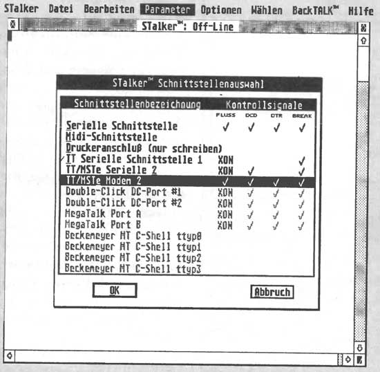 STalker unterstĂŒtzt alle Schnittstellen, die es im Moment aus der ST-Familie (dazu gehört auch der TT) gibt â also auch die neuen zusĂ€tzlichen seriellen Schnittstellen des Mega STE und TT. An Terminal-Emulationen unterstĂŒtzt STalker VT52, VT100 und ANSI. Dies sollte eigentlich fĂŒr jede Mailbox reichen.