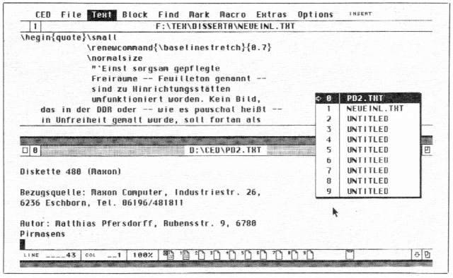 Neben Programmierern, für die CED einige besondere Leckerbissen bereithält, kommen vor allem TeX-Anwender auf ihre Kosten: Der Editor arbeitet problemlos mit der TeX-Shell und steuert nach Auslösen der »x«-Taste umgehend die fehlerauslösende Zeile an.