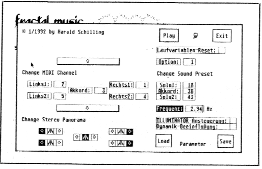 Ein recht eigenwilliges Programm präsentiert Karus & Nießen mit »fractal music«. Es generiert in Echtzeit endlos Musikstücke auf der Basis fraktaler Algorithmen. Die Grundidee, das grafische Fraktal in ein musikalisches Diagramm zu projizieren, stammt von Barry Martin. Die 128 Töne eines Keyboards werden dabei auf x- und y-Achsen abgebildet. Die fraktale Musikgenerierung erzeugt damit reichlich ungewohnte Klangkombinationen, die sich endlos aus sich selbst — durch stufenlose Parameterverschiebung mittels Maus — weiterentwickeln und aufbauen. Bewährt hat sich der Hüpfer-Algorithmus mit seiner grafischen Entwicklung vom O-Punkt nach außen. Das Klangergebnis bezeichnet der Hersteller als »New-age-Musik der besonderen Art«.