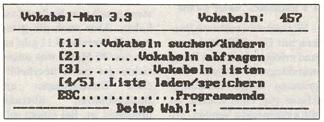 Diese Anwendung ist mit Turbo Pascal geschrieben und verrichtet daher seinen Dienst in bemerkenswerter Geschwindigkeit. In Vokabeldateien können Sie wie in einem Lexikon blättern, bestimmte Wörter automatisch suchen und sich selbst zur Kontrolle abfragen. Wörterdateien können Sie natürlich beliebig erweitern. Am Ende einer Abfragelektion wird Ihre Leistung bewertet.