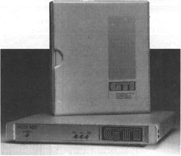 Doch nun zu unserem Gerät von »GTI«, die seit 1985 Hardware-Baugruppen für die ST-Computer entwirft. Rein äußerlich erscheint das flache, atarigraue, quadratische Metallgehäuse mit seinen Maßen — die in etwa denen des SM124 entsprechen — als idealer Monitoruntersatz. An der Frontplatte befinden sich neben der Betriebsanzeige-LED noch einige andere Signal-LEDs mit den Aufschriften »SEL« für einen ACSI-Zugriff, »CIC« für Controller-In-Charge (bedeutet, daß sich der IEEE488-Bus im Controller-Modus befindet) und letztlich die »ATN«-Anzeige, die den momentanen Zustand der ATN-Leitung anzeigt.