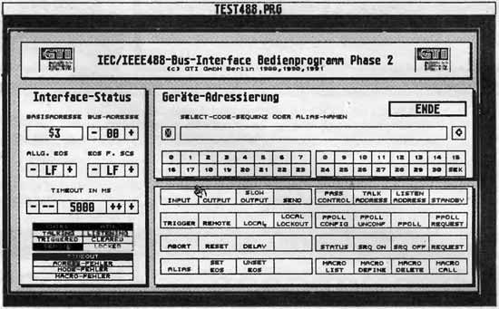 Ein besonders wichtiges und komfortables Programm ist »TEST488«, mit dem sich nahezu alle GPIB-Funktionen ohne eigene Programmierarbeit interaktiv ausführen lassen. Über dieses voll in GEM eingebundene Programm lassen sich alle Einstellungen bzw. Änderungen der I/O-Kanäle vornehmen bzw. Makros erzeugen und auch System-Starteinstellungen definieren.