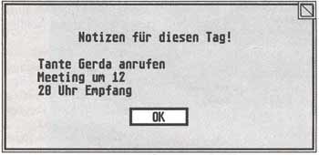 Die zweite Hälfte des Accessorys, der Notizblock, dient nicht allein dem Festhalten genialer Einfalle, wenn Sie gerade keinen Stift zur Hand haben. Es stehen maximal dreißig Seiten zur Verfügung, die Kalender auf Wunsch ausdruckt. Für jede dieser Seiten können Sie bestimmen, ob sie, wie die Termine, beim Systemstart automatisch angezeigt wird. Eine praktische Lösung, um lästige Verpflichtungen, die Sie allzu gerne auf die lange Bank schieben, trotzdem im Auge zu behalten (sofern der Rechner eingeschaltet ist).