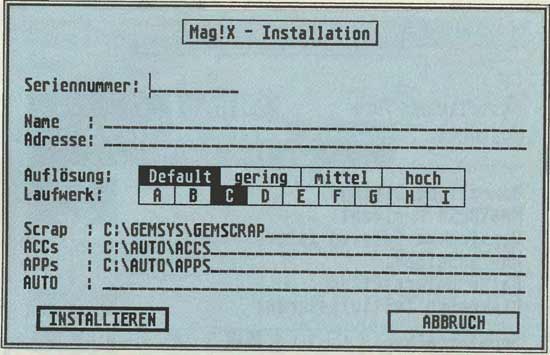 Hier müssen Sie Ihre Adresse und die auf dem Magix-Diskettenetikett aufgedruckte Seriennummer eingeben. Nun können Sie entscheiden, aus welchen Verzeichnissen beim Booten von Magix Programme und Accessories aufgerufen werden. All diese Applikationen laufen dann parallel. Darüber hinaus können Sie, wie seit TOS 1.04 üblich, einem Programm den Autostart-Status geben.