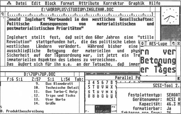 Falls Sie nicht sicher sind, welche Ihrer Programme multitaskingfähig sind, greifen Sie zu den mitgelieferten Applikationen, um sich ein erstes Bild vom Umgang mit Magix zu machen. Die AES-Lupe von Laurenz Prüßner stellt im Fenster Bildschirmausschnitte in verschiedenen Vergrößerungsstufen dar. Das zweite Programm ist eine kombinierte Analog-/ Digital-Uhr von Stefan Hintz. Beide laufen selbstverständlich auch unter normalen TOS-Versionen und lassen sich dazu als Accessories booten.