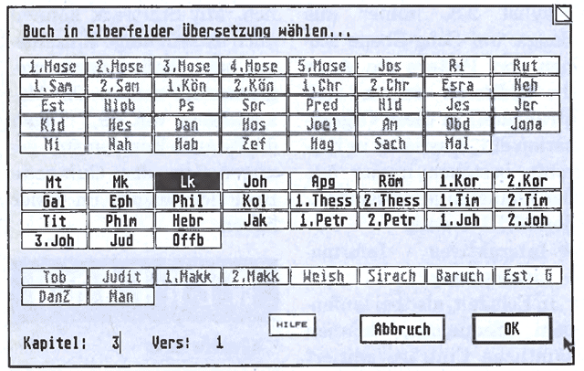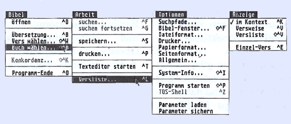 ĂuĂerst hilfreich dabei ist vor allem auch die GEM-BenutzerfĂŒhrung, Pop-up-MenĂŒs sowie Radio- und Check-Buttons Ă€ la Apple Macintosh. Sie können sogar ĂŒber den sichtbaren Bereich eines Fensters hinaus Verse markieren. Bibel ST ist multitaskingfĂ€hig, d.h. Sie können â ohne Bibel ST zu verlassen â Texte direkt in ein anderes, offenes Programm integrieren.