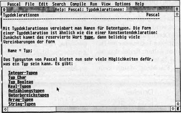 Am faszinierendsten ist der Eintrag Pascal, der zunächst auf eine Untergliederung führt: Sprachelemente, Konstantendeklarationen, Typdeklarationen, Variablendeklarationen, Ausdrücke, Anweisungen, Prozedurdeklarationen, Programme, Compiler-Direktiven und Pure Pascal intern. Klickt man auf Typdeklarationen, erscheint ein Textfenster mit einer kurzen grundsätzlichen Erklärung sowie einer Auflistung der Standardtypen einschließlich der benutzerdefinierten Typen, Aufzählungstypen, Unterbereichstypen und der Strukturen Array, String, Record, Objekt, Set (Menge), Datei, Zeiger und Prozedurtypen. Wann immer in einem Fenster Begriffe wie diese fett und unterstrichen dargestellt sind, kann man sie anklicken und erhält sogleich ein neues Fenster mit dem entsprechenden Untergebiet. Auch Querverweise auf verwandte Themen sind häufig. Mit der Undo-Taste kehrt man zum vorherigen Fenster zurück.