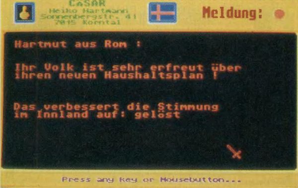 Ballerspiele üben meist nur einen kurzzeitigen Reiz aus und landen dann auf Nimmerwiedersehen in der Diskettensammlung. Ganz anders dagegen Strategiespiele: Hier kann man sich kaum vom Computer losreißen. Ein neues Spiel dieses Genres ist »Cäsar« von der Programmierercrew »Members of good Taste« um Heiko Hartmann. In diesem Spiel gehen sechs Feldherren daran, Herrscher der damals bekannten Welt zu werden. Wie der Name des Programmes schon vermuten läßt: es spielt etwa zur Zeit Cäsars. Das Ziel des Spieles läßt sich selbst bestimmen: die Eroberung des ganzen Mittelmeerraumes oder auch nur das Erreichen einer bestimmten Punktezahl; je nachdem, wieviel Zeit man investieren möchte.