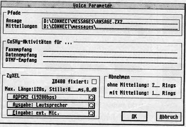 Zu Anfang müssen Sie einige Parameter einstellen. Dazu zählen der Aufnahme-und Abspielmodus des Zyxel. Hier gibt es drei Alternativen: Der ACPCM2-Modus ist ein guter Kompromiß zwischen Klangqualität und Speicherplatzverbrauch der Sprachdateien auf der Festplatte. Selektieren Sie ADPCM3, wird bei verbesserter Verständlichkeit der Sprachaufzeichnung die Kapazität des Speichermediums stärker belastet. Den CELP-Modus konnten wir nicht testen, weil er den Plus-Modellen des Zyxels Vorbehalten ist, die noch nicht verfügbar waren. Er verspricht bei stärkster Kompression weiter gesteigerte Klangqualität.