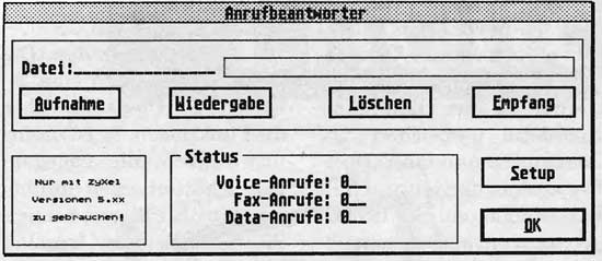 Beim Start des Programms öffnet sich eine Dialogbox im Fenster. Eine gutes Zeichen für den Sachverstand des Programmierers Matthias Stürmer, da dies eine günstige Voraussetzung für den Betrieb unter MultiTOS ist. Es wird die Nummer der aktuellen Ansage, also jene, die beim nächsten Anruf abgespielt wird, sowie die Mitteilungsnummer, ab der aufgenommen werden soll, angezeigt. Sie können diese Werte sowohl per Maus über Richtungspfeile, als auch durch Direkteingabe verändern. Darunter befindet sich die Einstellmöglichkeit, welche Art von Anrufen wie behandelt werden. Etwa, ob nur die Ansage ausgegeben werden soll, oder auch Mitteilungen aufgenommen werden und, ob Fax- und Datenanrufe an die in der Konfigurationsdatei eingetragenen Programme mit festzulegender Kommandozeile weitergeleitet werden sollen. Es existiert sogar schon eine Funktion »Fax anzeigen« in Teil It, die jedoch so lange unberührt bleiben wird, wie die Hersteller von Fax-Programmen auf dem Atari nicht in der Lage sind, ihre Programme extern mit den entsprechenden Parametern steuern zu lassen.