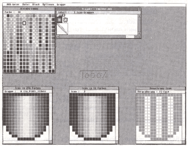 Der AAS-Grafik-Editor: mit ihm ist es möglich, Grafiken in 256 Farben zu entwerfen, die in Gruppen angeordnet werden können. Ein einzelnes Grafikelement kann in einem eigenen Fenster dargestellt, stufenweise bis zu 20fach vergrößert und editiert werden. Gleichzeitig werden auch die beiden anderen Farbmodi in je einem eigenen Fenster dargestellt. Alle Grafik-Elemente werden zusammen in einem großen Bild, dem Quellbild, abgelegt und können im farbfähigen XIMG-Bildformat gespeichert werden. Dieses XIMG-Bild wird dann vom AAS eingelesen und als Quellbild für das kollageartige Ausschneiden mit den VDI-Rasterkopierfunktionen benutzt.