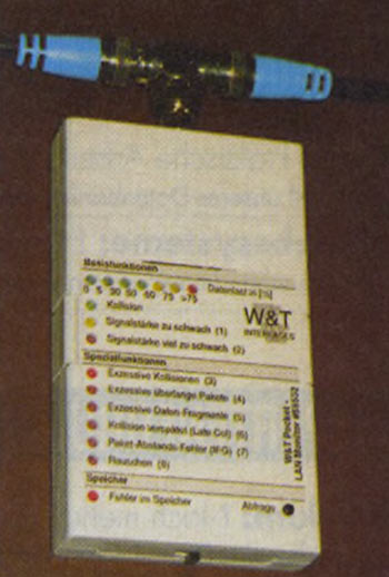 Der Pocket-Monitor wird an beliebiger Stelle an ein freies T-Stück ins Netz eingebunden. Er beobachtet die elektrischen Vorgänge auf dem Kabel und zeigt alle Anomalien sowie die Datentastrate an. Leuchtdioden zeigen Fehler an, die auf der Geräterückseite erläutert werden: zu lange Kabel, Kabelbruch, zu tief verschachtelte Repeater, defekte Station oder Interframe-Gap-Error. Der Wächter kostet 798 Mark.