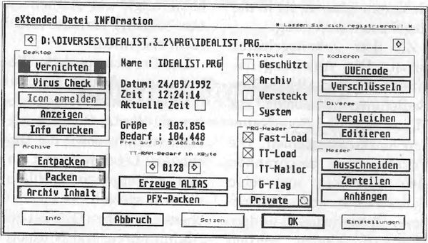 Wurde XINFO beim Start eine ausführbare Datei übergeben, stehen Funktionen zur Attribut- und Programm-header-Änderungen zur Verfügung. Der Dateiname läßt sich natürlich auch ändern. Bei Programmen können im Header die Einstellungen »Fast-Load« (beim Aufruf des entsprechenden Programmes wird nicht das gesamte RAM gelöscht, sondern nur das BSS-Segment, was weniger Zeit benötigt), »TT-Load« (lädt mit diesem Flag versehene Programme direkt ins Fast-RAM von TTs), »TT-Malloc« (Programme, die nicht MXALLOC zur RAM-Reservierung benutzen, bekommen bei gesetztem Flag TT-Fast-RAM zugewiesen), »G-Flag« (ein von ATARI noch nicht dokumentiertes Flag, das für MultiTOS relevant ist) und schließlich »Memory-Protection« (bestimmt, wie im Multitaskingbetrieb (MiNT/ MultiTOS) ein Speicherbereich, den ein Programm verwendet, gehandhabt wird) festgelegt werden.