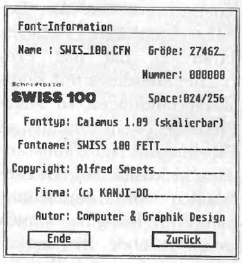 Sie können XINFO auch eine Fontdatei übergeben. Das Programm erkennt Zeichensätze von Calamus, Calamus SL und Didot Professional. Angezeigt werden kann Spacing, Seriennummer, Größe, Typ, Name, Autor, Copyright und Herstellerfirma. Außerdem wird eine Schriftprobe ausgegeben. Für DTPler ein wichtiges Feature.