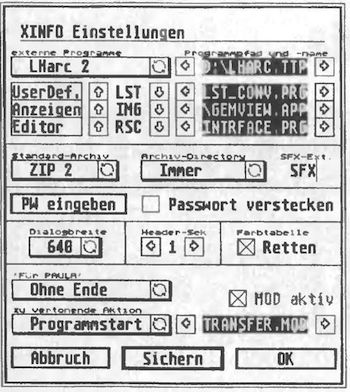 Erwähnenswert ist, daß XINFO zwar auch eigene Funktionen anbietet, meistens jedoch als Shell fungiert. Das heißt, daß beispielsweise zwar Archive erkannt werden, zum Entkomprimieren jedoch ein entsprechender Packer notwendig ist. Bleiben wir gleich bei den gepackten Dateien, von denen XINFO folgende erkennt: LZH, ARC, ARJ, ZIP, ZOO und selbstextrahierende SFX-Dateien. Archive können entpackt und der Inhalt gelistet werden. Umgekehrt können einzelne Dateien oder ganze Ordner komprimiert werden. Dazu muß der Pfad des entsprechenden Packers festgelegt werden. Fehlen diese Angaben, bietet Ihnen XINFO die Möglichkeit, den entsprechenden Komprimierer in einer Fileselectbox auszuwählen.